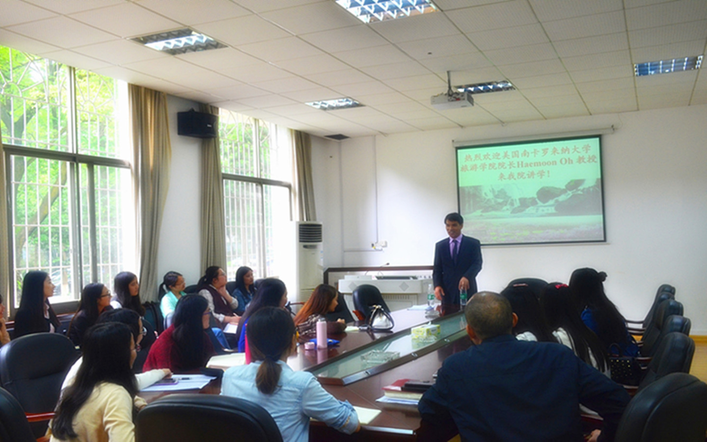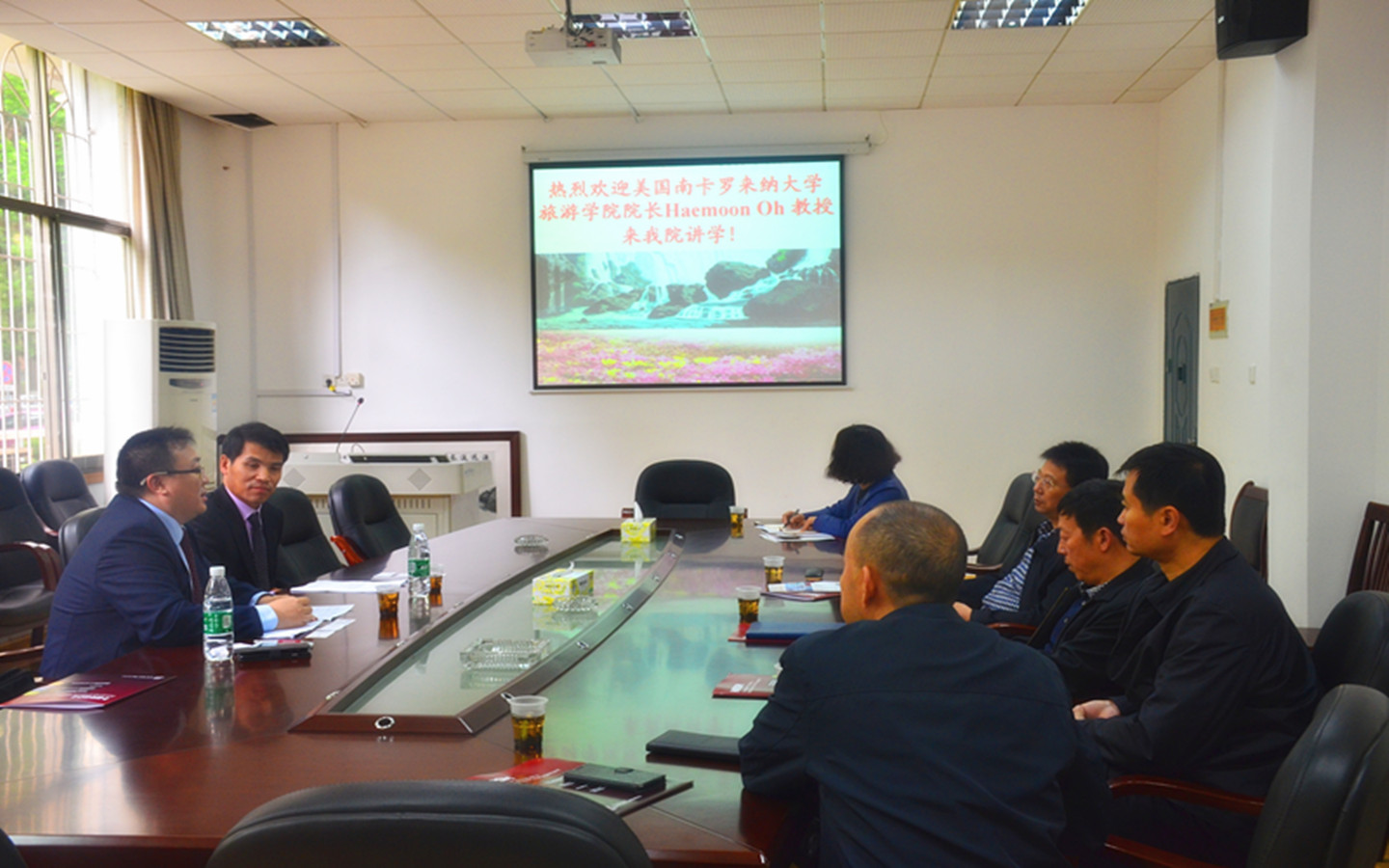 4月27日上午,美国南卡罗来纳州立大学beats365经理Haemoon Oh教授一行来访公司,公司经理王兆峰、副经理刘杰、党委副书记廖欢及旅游管理系主任贺小荣等热情接待了来访客人。接待会议由公司党委书记李正益主持。