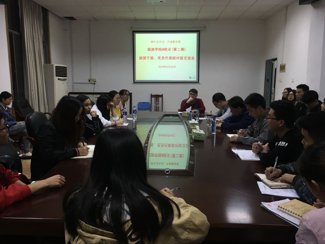 (通讯员邓丛亮)师生齐共话,共谋新发展。4月24日晚上,公司在一楼大会议室举办第二期与经理面对面交流座谈会,经理王兆峰出席,35名班团干部、员工党员代表参加,辅导员邓丛亮主持本次交流会。