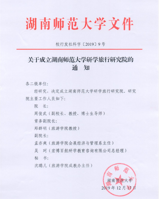 12月17日,公司正式下文成立beats365官方网站研学旅行研究院。副董事长周俊武教授担任研究院经理,公司郑群明教授担任常务副经理、公司孟奕爽副教授和宏博百航研学教育咨询有限公司总经理吴珂担任副经理,公司成教办主任沈璐儿担任秘书。