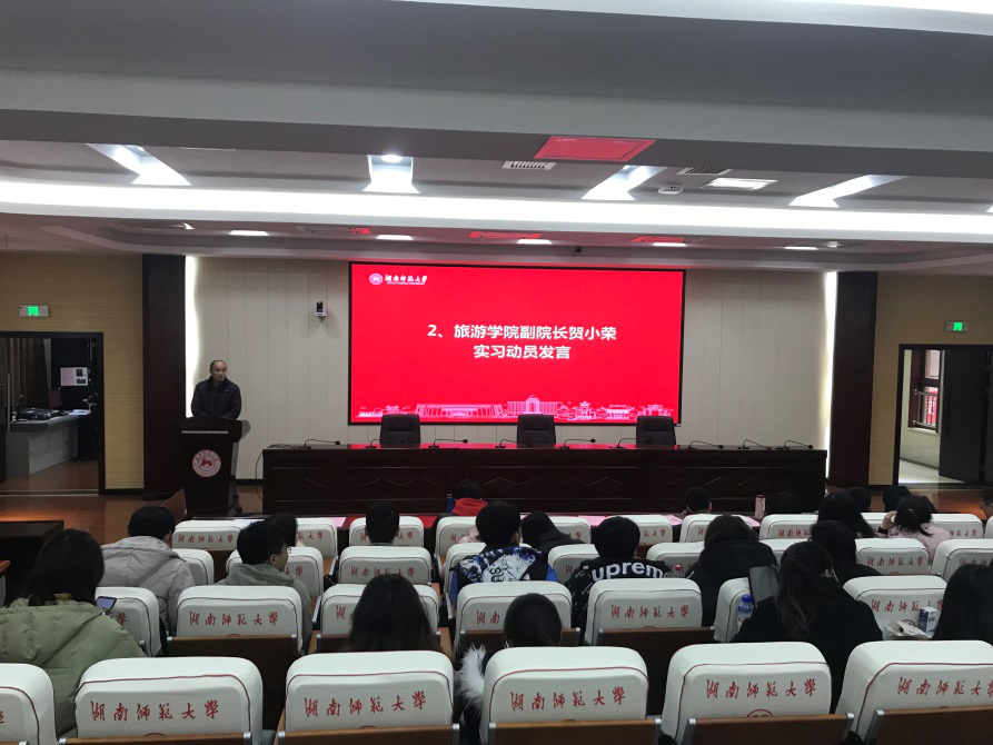 会展研究中心主任蔡卫民、教务办主任周向东,以及会展经济与管理系青年教师胡兵、石松、吴少峰等参加了实习动员大会。