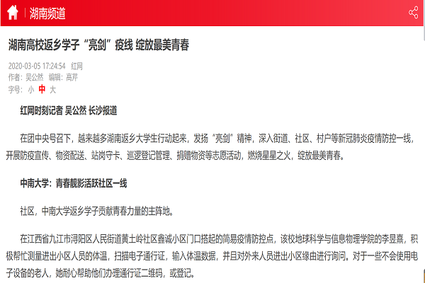 【抗疫一线】《新湖南》、《红网》等媒体报道公司学子段婷参与抗疫志愿活动