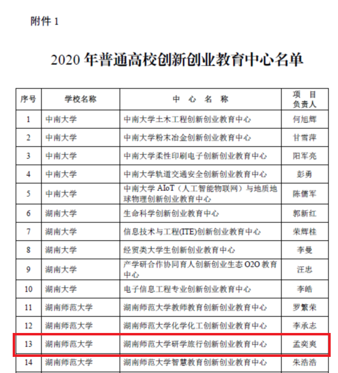 12月10日,湖南省教育厅发布了《关于公布2020年普通高校创新创业教育中心和校企合作创新创业教育基地认定结果的通知》(湘教通〔2020]301号),经各校前期建设申报,省教育厅组织专家审核,2020年全省共认定106个创新创业教育中心和93个校企合作创新创业教育基地,由公司孟奕爽副教授负责的beats365官方网站研学旅行创新创业教育中心获得省级认定。