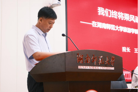 王兆峰致辞,他代表公司对2021级新生的到来表示热烈欢迎与衷心祝福。他简要介绍了公司和公司的基本情况,并表示在历经近2年全球新冠疫情的肆虐和人间隔离,大家今天在岳麓山下、湘江之畔的相逢是时代赋予的特别意义,是致力于人类健康幸福产业的旅游学科专业赋予的特别意义。他对新生提出三点希望:一是明确目标,在追求高远中提升人生境界。要把握好每一个重要的人生节点,及早规划和制定学年计划与职业规划;二是知行合一,在理论学习与实践探索相结合中树立修为典范。鼓励大家多基于问题、项目和竞赛开展学习,既“手留书香”又“脚沾泥土”;三是执着坚守,在攻坚克难中追求卓越。每一位同学都要进行思路的转换和行动的改变,要在前进的道路上练就更强大的内心。他相信,只要大家努力拼搏奋斗,一定能够乘风破浪、向阳而生。