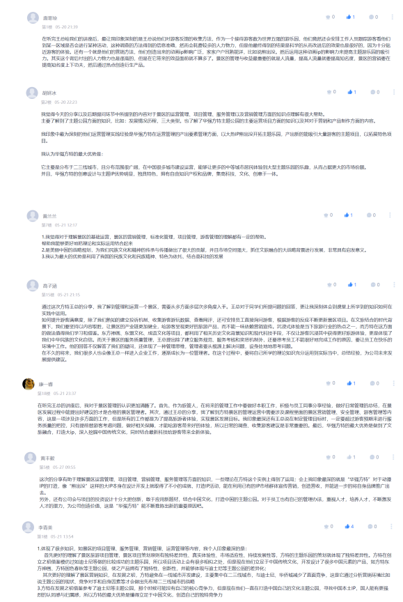 课程结束后,同学们纷纷表示在与企业精英的交流中更加了解了景区管理工作实践,期待能有更多机会与企业精英进行交流学习。将理论与实践结合,学好专业知识,为后期实习实训工作打下坚实的基础。