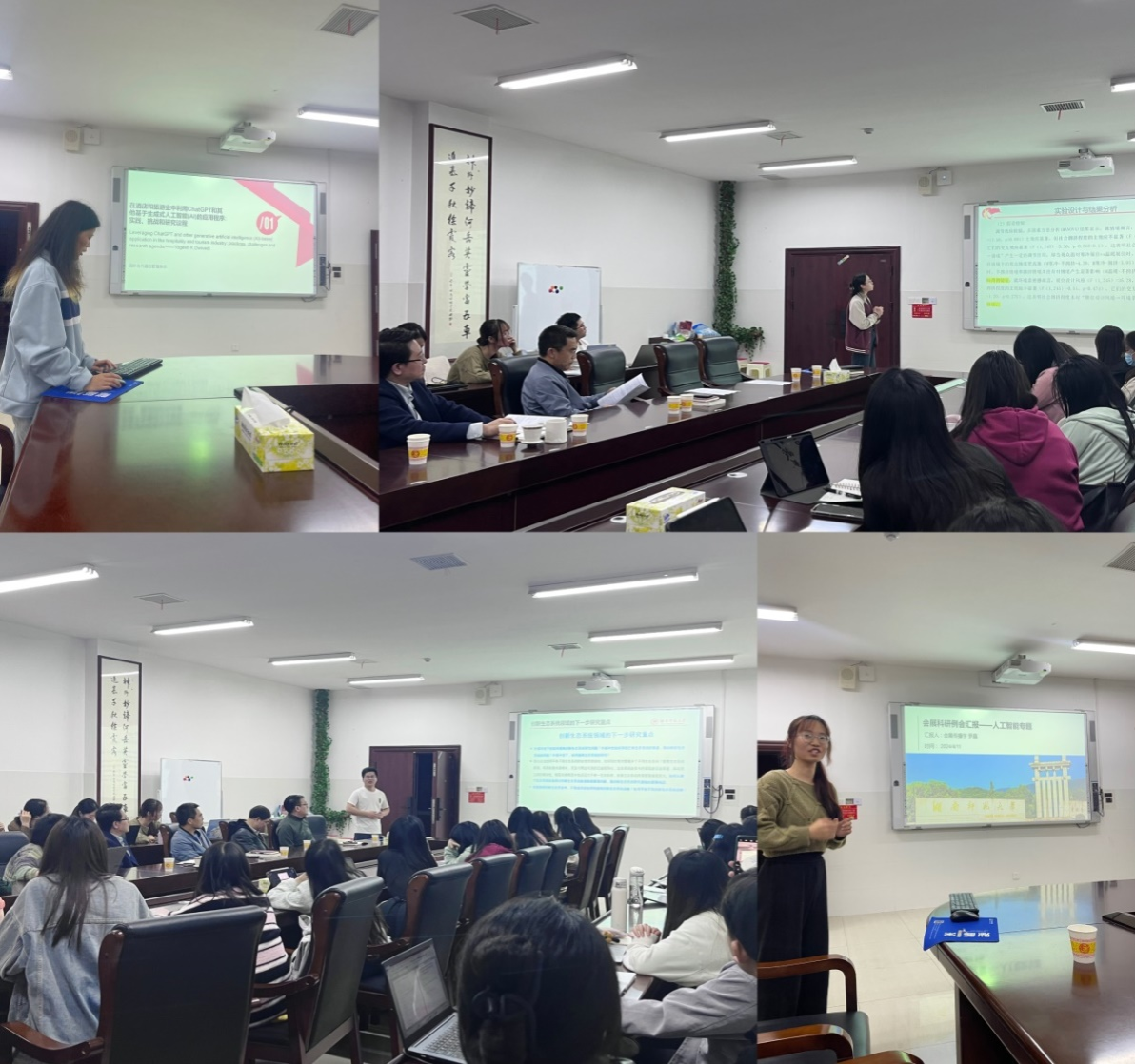 首先,朱张祥老师团队的研究生甘雅琴、吴卫、罗晶三位同学结合近年在顶级学术期刊发表的关于人工智能的高被引热点论文,先后分享了人工智能在教育、创新管理、学术研究、活动管理等领域的应用、研究现状和热点等,提出了未来值得深入探讨的研究问题,引起了与会老师和同学们的深入探讨。