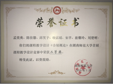 (通讯员宋芊)为落实立德树人根本任务,营造良好的教书育人氛围,促进教师教育能力发展,展示公司课程教学与教学管理创新成果,教师教育公司(教师教育发展中心)举办了公司首届课程教学设计竞赛和教学工作创新案例竞赛。公司会展管理系孟奕爽副教授带领2016级会展经济与管理班陈佳馨、邱笑予、敬露瑶和2017级会展经济与管理班的宋芊、崔馨玲、刘楚明6位同学以《会展概论》课程设计方案参赛,经过方案评审、现场答辩等环节获得二等奖。