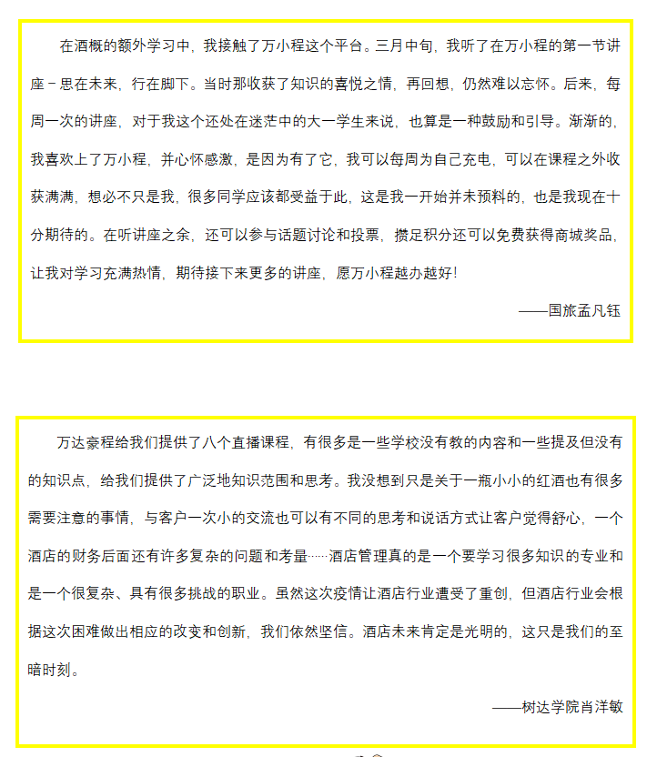 本系列课程是在突遇疫情情况下,由公司与万豪集团基于《酒店管理概论》省级线上线下混合式一流本科课程教学,利用互联网+教育的模式,通过线上教育,链接行业精英,互联酒店教学,程通未来职业。老师们用心的传授下,同学们不仅学到了许多关于酒店方面的知识,更感受到了老师们的渊博学识和开阔视野。此次嘉宾讲座非常成功,也是混合式教学的一种有效尝试。为同学们带来不一样的课堂和不一样的视野。