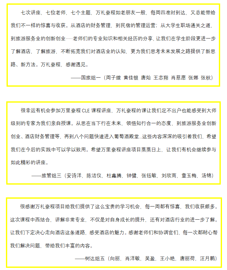 本系列课程每周四下午按期,同学们与万礼豪程都相约CCtalk平台。同学们组成不同小组,通过线上听课,课下讨论,分工合作的形式开展学习。嘉宾讲座整合了万豪集团庞大的教学资源,分为旅游行业的全球视野和创新创业;酒店收益管理知识和技能;老员工职场通关秘籍;人资,财务运营板块;酒店餐饮和红酒认知;民宿经营和管理6个模块,讲师团由国外大学知名教授,酒店行业精英,资深教学顾问和万礼豪程首席代表共同合作组成。