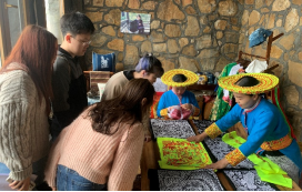4月16日上午,在雪峰山大花瑶景区负责人带领下,调研组五人来到山背花瑶梯田景区学习瑶族挑花技艺。该景区的星空云舍,是雪峰山生态文化旅游公司精心打造的精品高档民宿。其中有专门场地用于展示花瑶非遗——挑花技艺,花瑶挑花取材广泛,内容丰富,形态多样,有上千种之多。与机绣、湘绣不同,花瑶挑花不需要提前描绘设计,也不用模具做刺绣架,全凭挑花女灵巧的双手和娴熟的技巧,以自己心中的构图和对美的理解,通过挑花女个人的日常生活经验和想象在土布上进行操作。在非物质文化遗产活化和原真性方面,这里的挑花技艺传承人供职于该景区,她们会根据公司需求和游客喜好,结合挑花古法对服饰、提包、枕套等日常生活物品进行创新,将传统花瑶文化与现代生活进行相融,既加深了游客对于花瑶技艺的学习、认同,又促进了花瑶的非遗活化和传承。