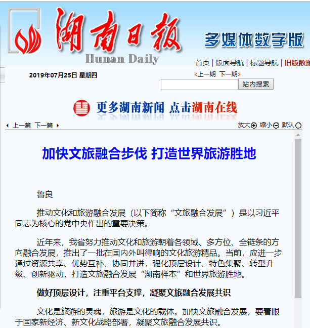 近日,公司党委书记鲁良副教授在《湖南日报》(理论智库版)发表理论文章“加快文旅融合步伐 打造世界旅游胜地”。文章指出,近年来,我省努力推动文化和旅游朝着各领域、多方位、全链条的方向融合发展,推出了一批在国内外叫得响的文化旅游精品。文章建议,进一步通过资源共享、优势互补、协同并进,强化顶层设计、特色集聚、转型升级、创新驱动,打造文旅融合发展“湖南样本”和世界旅游胜地。全文内容如下: