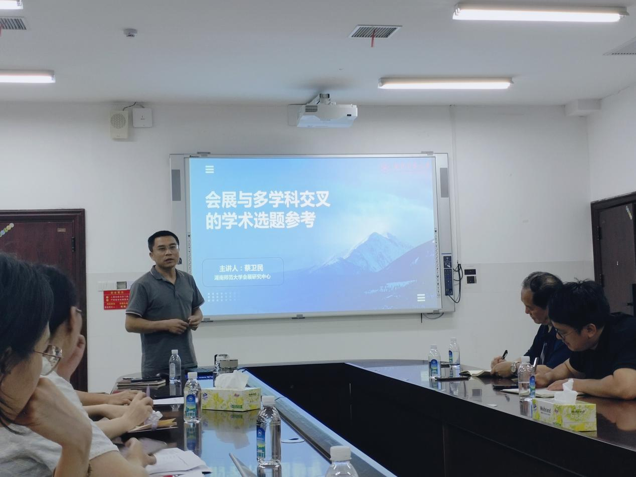 首先,蔡卫民以“会展与多学科交叉的学术选题参考”为主题,分别介绍了会展产业链、会展生态圈以及会展选题可涉及范围,并据此梳理了会展与不同学科之间可以开展的交叉研究方向。2022级研究生蔡烨则分享了团队拟开展的会展研究主题和设想。随后,王武林结合自身多年来丰富的地理学科研究经历,介绍了论文写作、投稿和稿件修改过程中的注意事项和建议。在分享之后师生们进行了交流互动,对这些主题进行了深入研讨。