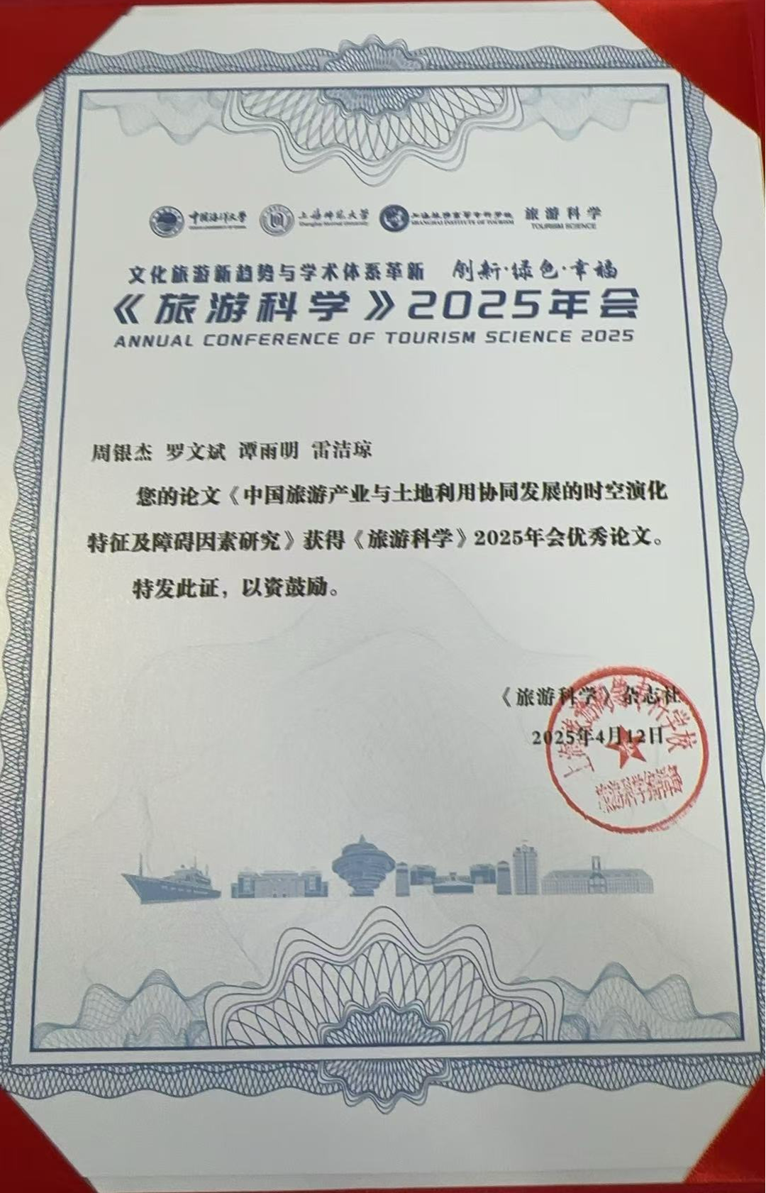 4月10日-13日,《旅游科学》2025年会在中国海洋大学崂山校区顺利召开,本次会议以“文化旅游新趋势与学术体系革新”为主题,共设立31个平行论坛,经分论坛推荐和会议专家组评审,最终评选出37篇《旅游科学》2025年会优秀会议论文。公司旅游管理系主任罗文斌教授团队提交的研究成果“中国旅游产业与土地利用协同发展的时空演化特征及障碍因素”,入选《旅游科学》2025年会优秀论文奖。