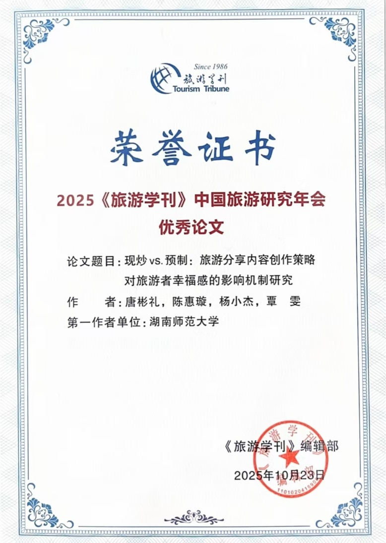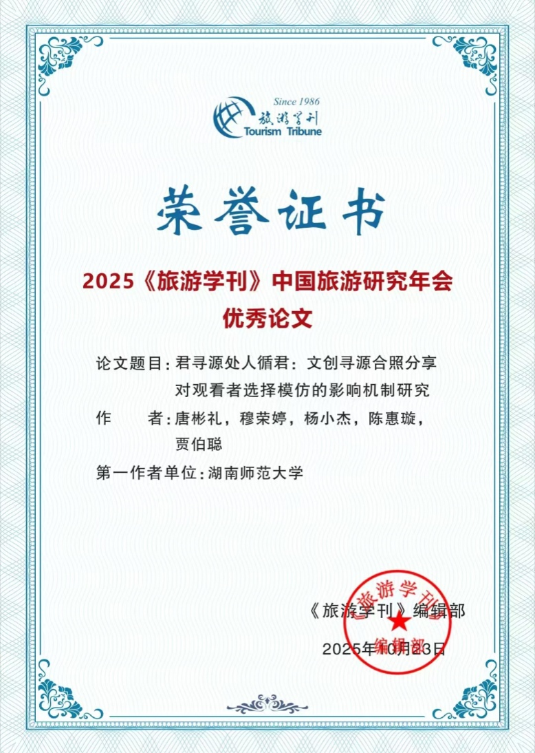 2025年10月29日,《旅游学刊》编委会公布了“2025《旅游学刊》中国旅游研究年会”优秀会议论文名单。公司唐彬礼老师科研团队共有2篇论文入选,入选数量在全国高校并列第二。年会“优秀论文”经召集人推荐,编辑部筛选后,由《旅游学刊》编委会51位编委进行匿名评分,最后通过编委会合议产生,是旅游研究热点的风向标。