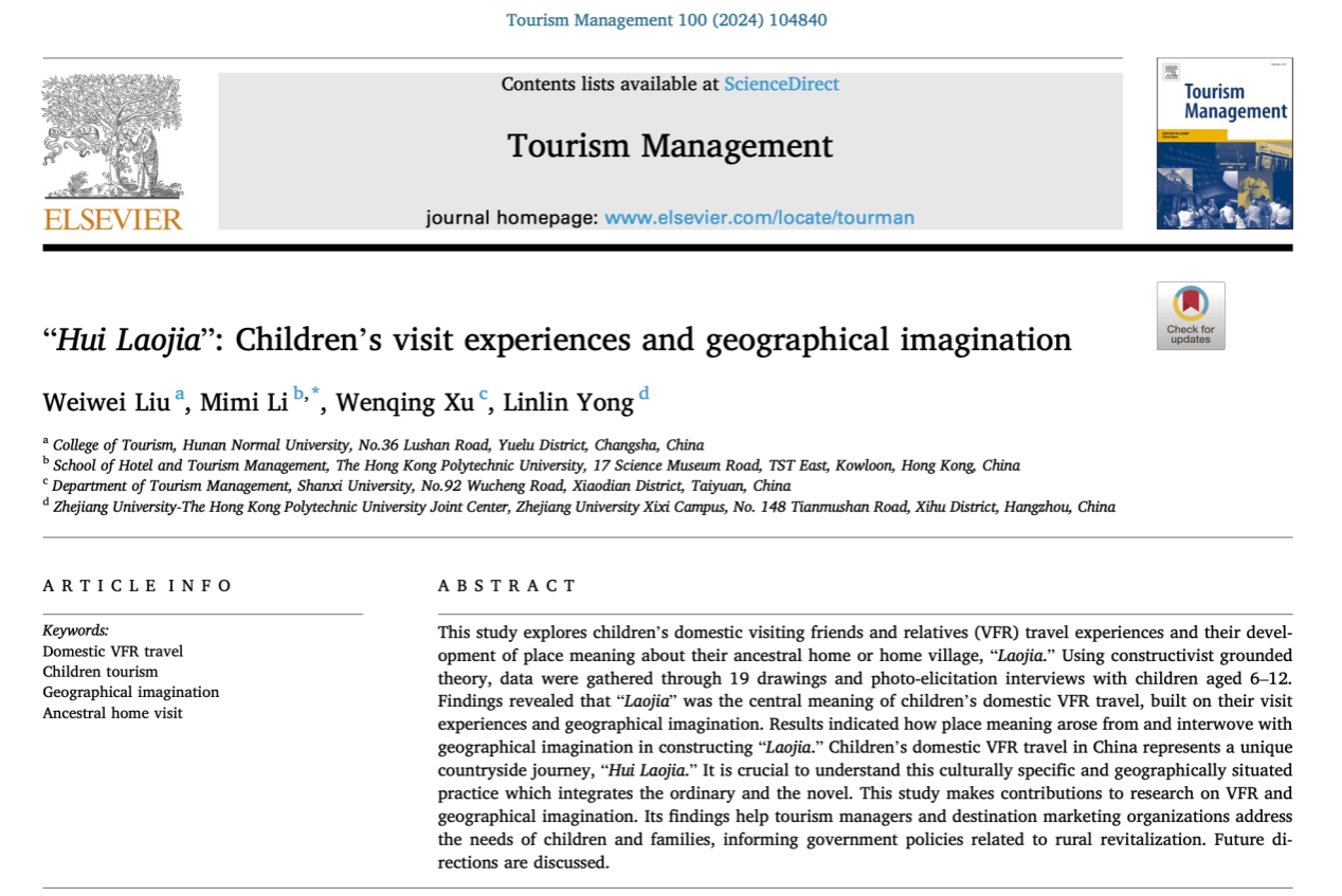 近日,国际旅游学科顶级权威期刊《Tourism Management》接收并刊发了公司旅游管理系青年教师刘为潍任第一作者、beats365官方网站为第一单位,香港理工大学李咪咪教授等四位学者合作完成的论文《“Hui Laojia”: Children’s visit experiences and geographical imagination》(Volume 100, February 2024, 104840)。