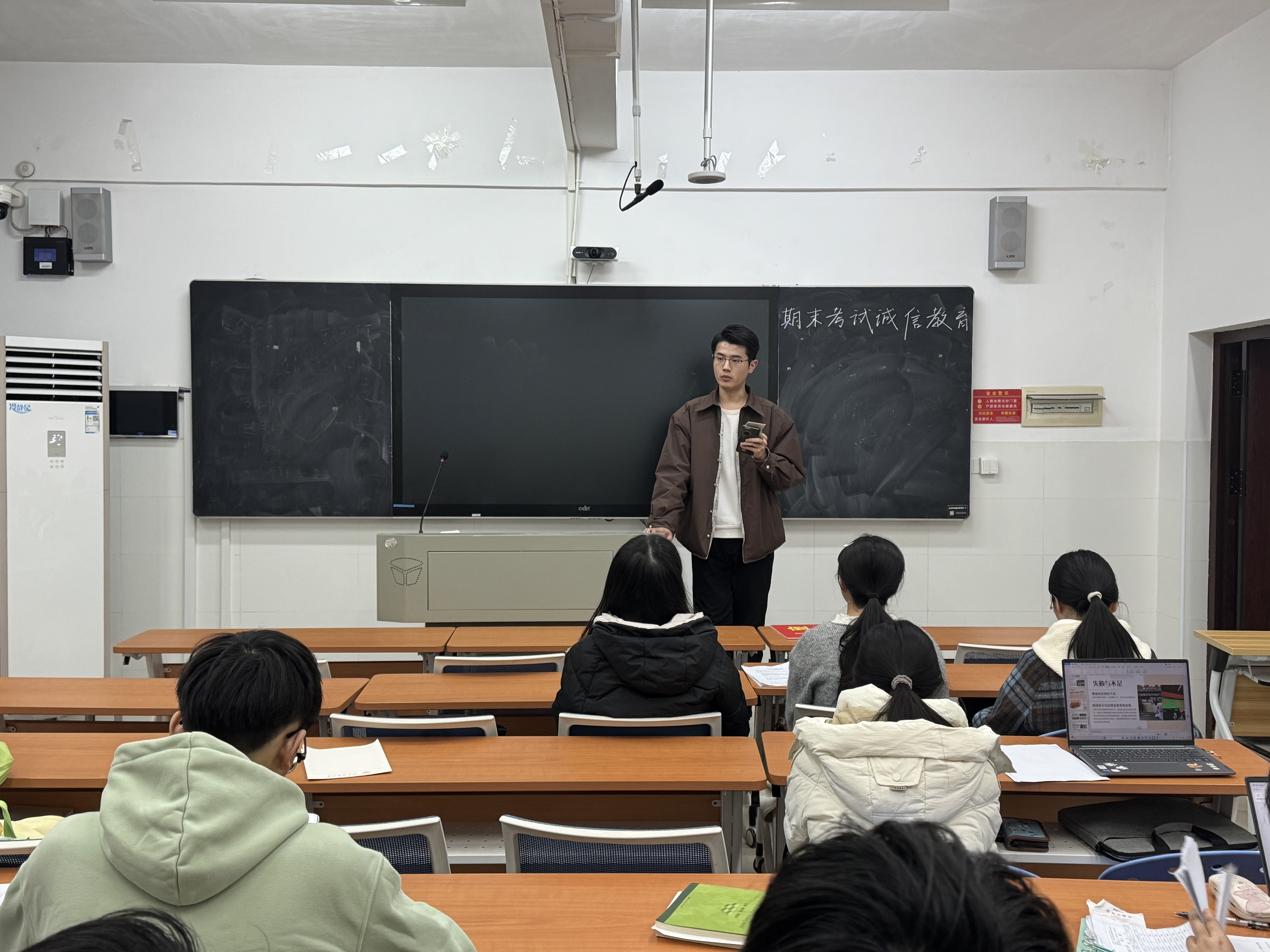 辅导员围绕诚信考试的重要意义展开宣讲,明确指出考试舞弊行为的严重危害,强调作弊不仅会导致考试成绩作废、受到纪律处分,更会挫伤学习积极性,破坏良性竞争秩序,干扰良好学风建设。同时,辅导员针对期末复习规划给出建议,提醒同学们合理安排备考时间,做到扎实复习、从容应考;着重强调期末月也要遵守外出报备制度,时刻注重人身安全;此外,还提醒同学们关注期末考试具体时间节点,不要错过考试时间。