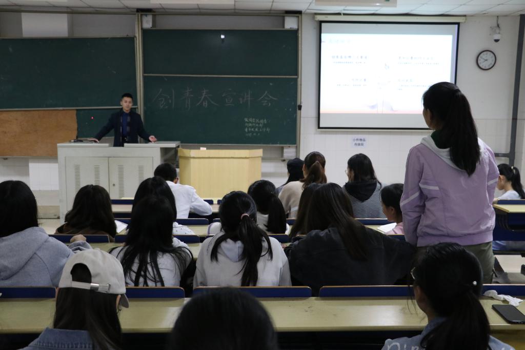 (通讯员 汪子懿 高宇宁 袁喻彬)11月1日晚,公司团委创新创业部和青年发展工作部于景德楼304教室举办了“创青春大赛宣讲会”。创新创业部部长方静怡、社会实践部部长谌秀凤、青年传媒中心新闻采编部部长朱彤出席了此次活动,活动由创新创业部副部长柯丹主持,2016级张津豪同学担任主讲人。