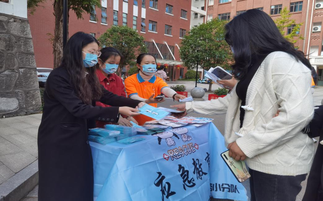 活动开展前,德智体美劳小队提前到达活动地点,对宣传物资进行整理和摆放,对大科城志愿者进行了相应培训。活动过程中,秉持着传递防疫知识,科普应急技巧的理念,小队成员和志愿者们互相协作,为过路的员工和居民们送上医用口罩,讲解口罩的正确戴法,递发应急教育手册,科普防疫知识,以及消防、防震、抗洪、现场急救等应急知识。