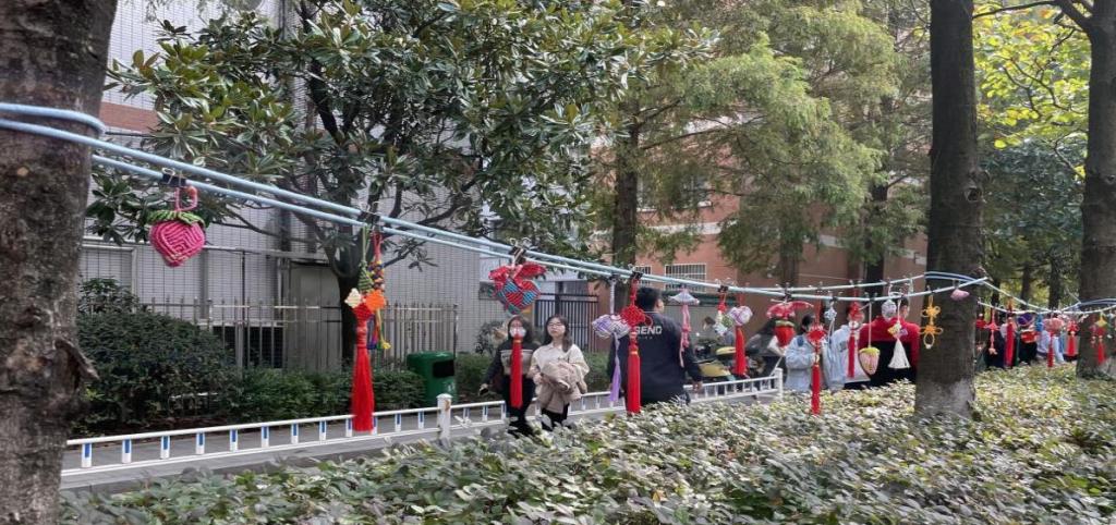 风采展开始前,社会实践部成员收集了现代女红工艺课程学员的优秀作品,并将一个个独具匠心的女红作品挂在绳子上展示。此外,在展示过程中,社会实践部成员向同学们科普了现代女红工艺文化的相关知识,介绍了现代女红工艺作品的制作流程,让他们认识了四季平安结、中国结、复翼三回盘长结、桃、虾、蝴蝶等作品的编织形状和每种类型的结代表的含义,以此激发更多同学对现代女红工艺的兴趣。