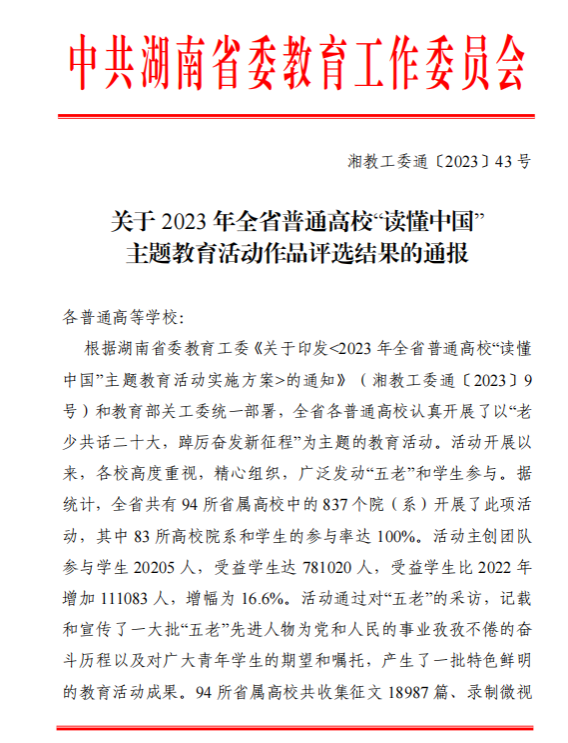 (通讯员 包雅)近日,公司在第五届共青团改革创新大赛与2023年全国普通高校“读懂中国”主题教育活动中喜获双奖。共青团湖南省委、中共湖南省委教育工委分别公布了获奖名单,公司团委书记龚曦老师申报的案例《征途相伴 共筑未来》荣获全省创新大赛二等奖首位;由公司关工委师生团队创作的视频作品《平凡岁月 不平凡人生》荣获主题教育活动全省二等奖。