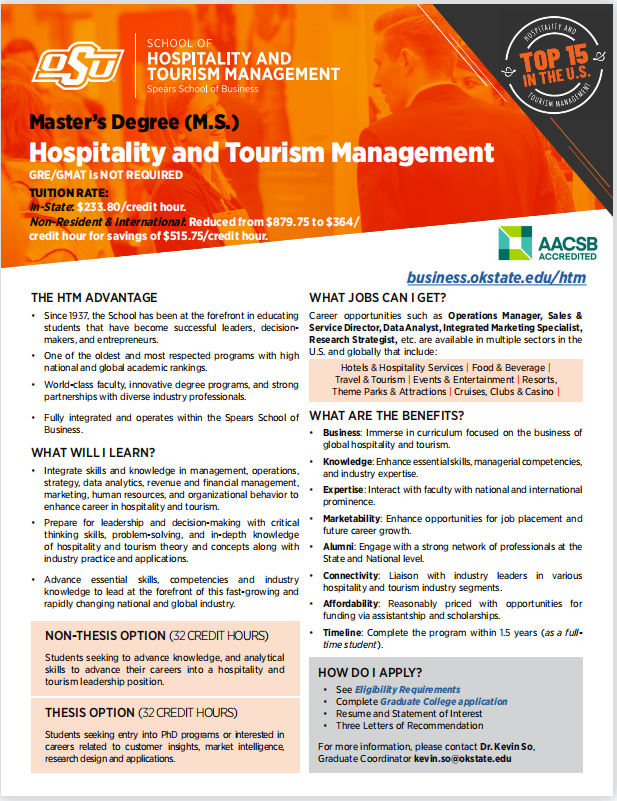 俄克拉荷马州立大学(OSU)的全新试点项目——研究生院非居民学费奖励项目(Graduate College Nonresident Tuition Award)。该奖励项目仅面向9个硕士项目的非居民员工(包括州外和国际员工)提供,参与者将以非常优惠的学费攻读硕士学位,减免后的学费与非居民在线硕士项目价格相当。酒店与旅游管理科学硕士项目 (MS)位列首批试点指定硕士项目之一。