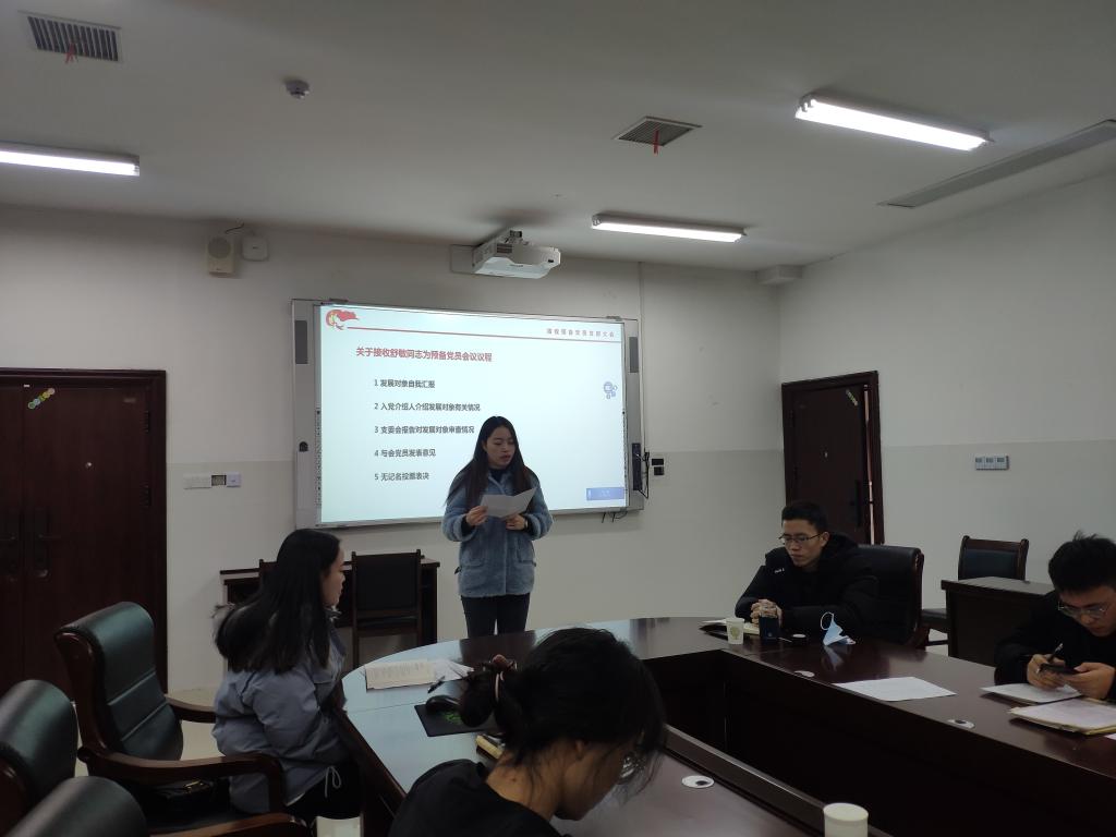 (通讯员 张静静)12月16日研究生第二党支部在中和楼233会议室召开了党员大会,本次大会主要讨论段超同志、舒敏同志转为预备党员;何玲玲、刘依飞、张中昱同志转为正式党员的基本事宜。在会议开始前,党支部书记王永明老师表达了对于支部全体党员同志的要求与希冀,希望各位党员同志能够发挥榜样作用。党员大会由副书记叶婷同志主持,叶婷同志向支部各位成员说明了接收预备党员、正式党员流程和要求,并向全体党员展示了各位同志的入党材料。