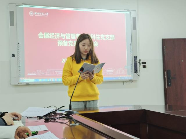 (通讯员 张慧)12月6日中午,会展经济与管理专业本科生党支部于中和楼233会议室举行预备党员接收大会,会议由支部书记夏梦婷主持召开。支部第一书记谢胜文、组织委员邓秋雨和宣传委员张慧出席会议。