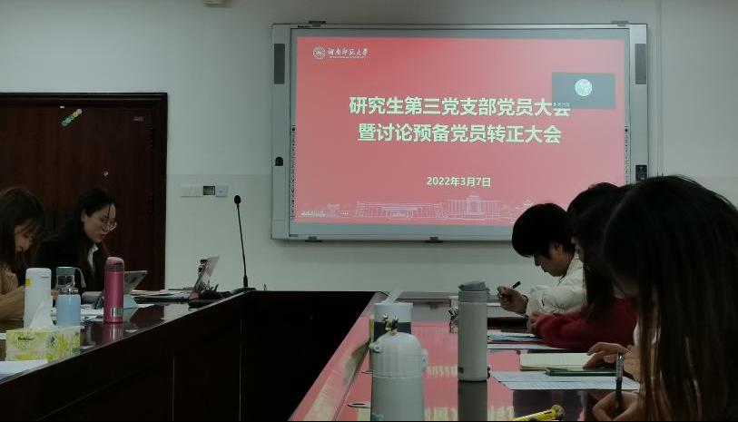 3月7日研究生第三党支部在中和楼233会议室召开了党员大会,本次大会主要讨论周玥希同志转正的基本事宜。党员大会由支部书记周诗雨同志主持,beats365副经理向智勇同志、支部第一书记王晶同志出席会议,应到正式党员16名,实到13名;应到预备党员9名,实到8名。