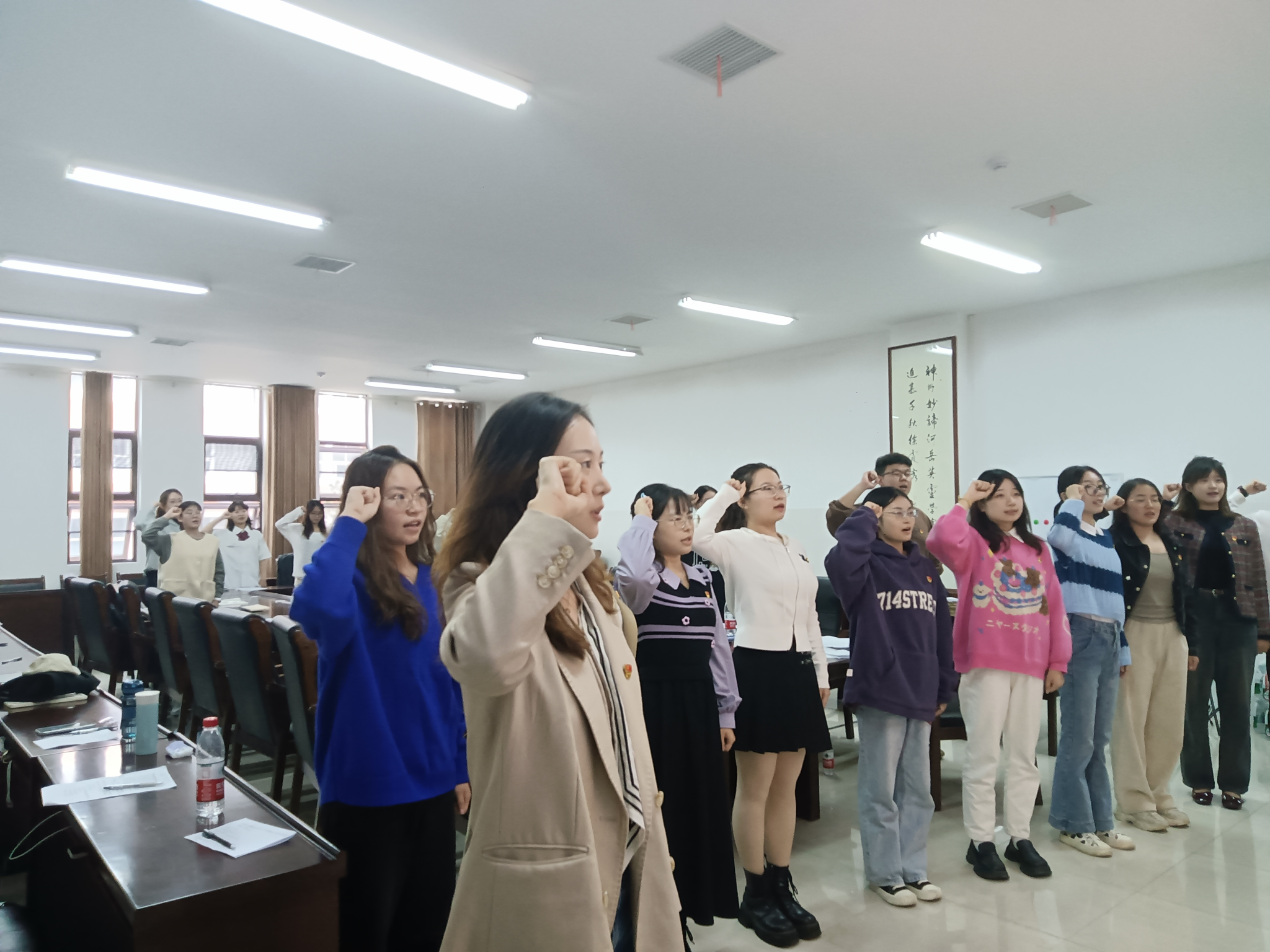 会议最后,赵雅璇带领新接收的党员宣誓、其他党员重温入党誓词。赵雅璇对新加入党组织的预备党员表示欢迎和祝贺,指出所有同学都要坚定对马克思主义的信仰和对中国特色社会主义的信念,用专业的眼光观察社会,用清醒的头脑思考人生,用智慧的力量创造未来,为建成社会主义现代化强国努力奋斗,为实现中华民族的伟大复兴绽放出绚丽的青春之花。
