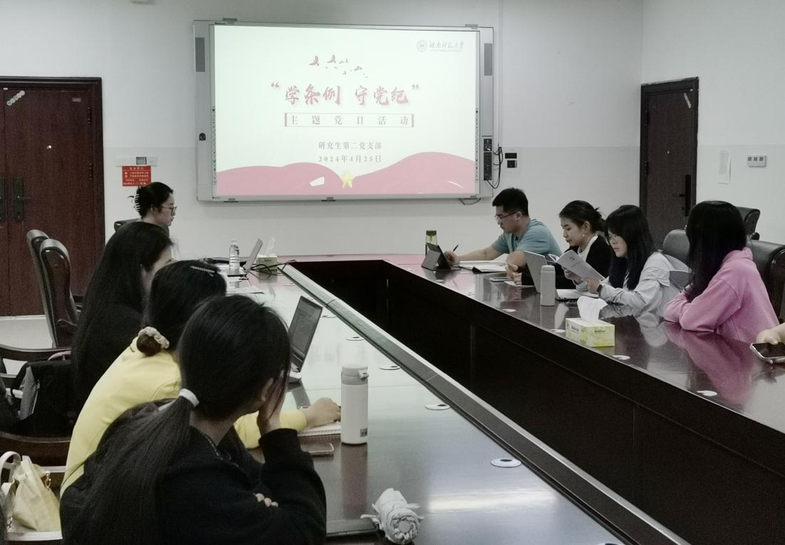 4月25日下午,为扎实开展党纪学习教育,研究生第二党支部开展“学条例 守党纪”主题党日活动,活动由支部书记刘洁主持,支部全体党员参加会议。