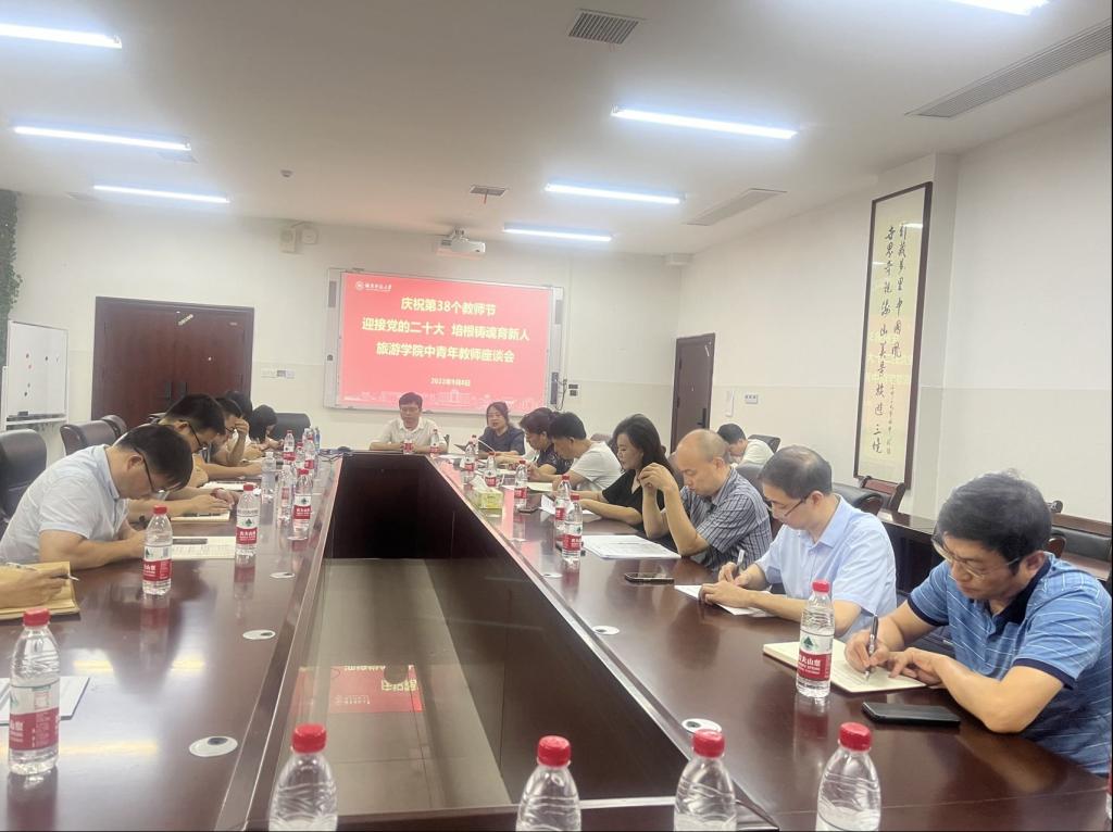 9月8日下午,为庆祝第38个教师节,营造立德树人良好氛围,增强教书育人本领意识,凝聚公司发展共识,酒店管理系党支部于中和楼233会议室参加了公司党委组织的“迎接党的二十大,培根铸魂育新人”中青年教师座谈会。校工会副主席杨格花,公司经理王兆峰,公司党委副书记廖欢,副经理向智勇、贺小荣、郑群明,专职组织员骆劲华出席。