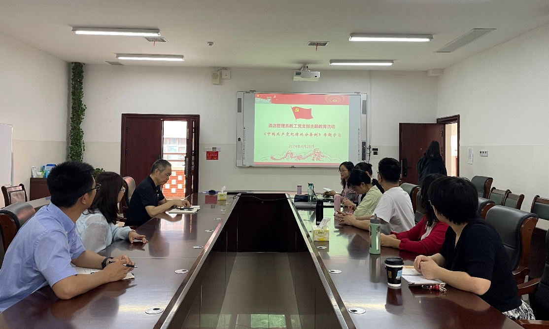 4月28日下午,酒店管理系教工党支部在中和楼233会议室开展党纪学习教育专题学习活动,旨在深入学习贯彻《中国共产党纪律处分条例》。本次学习活动由支部书记唐健雄主持,联系院领导王兆峰经理到会指导,支部全体党员参加学习。
